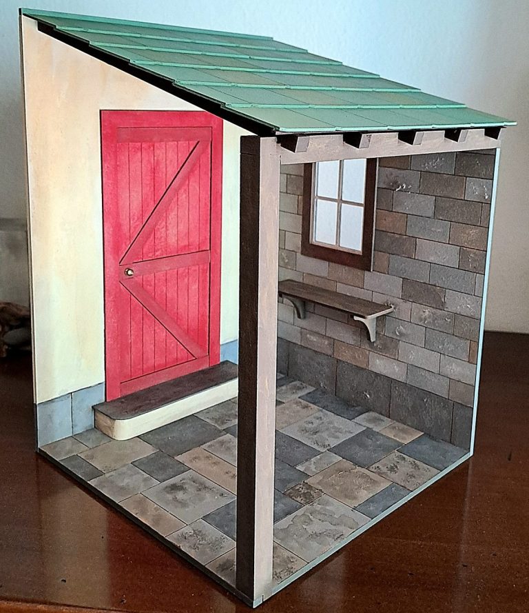 The set consists of 35 pre-cut wooden parts that must be assembled to fit perfectly. In addition, the course instructor shows how to paint the walls, floor tiles and roof realistically with acrylic paints and age them as desired with powder patina.
