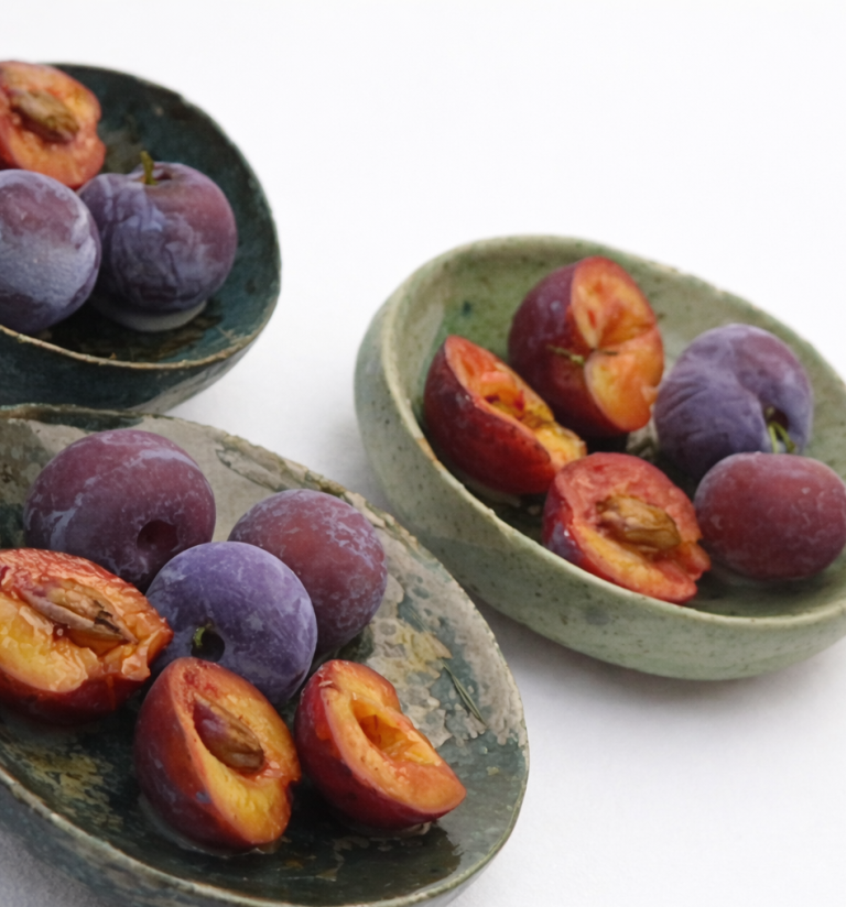 Juicy plums, whole and sliced fruits with stones, vibrant flesh and fine natural details this time are on the curriculum from Fimo expert Cristina Hampe.