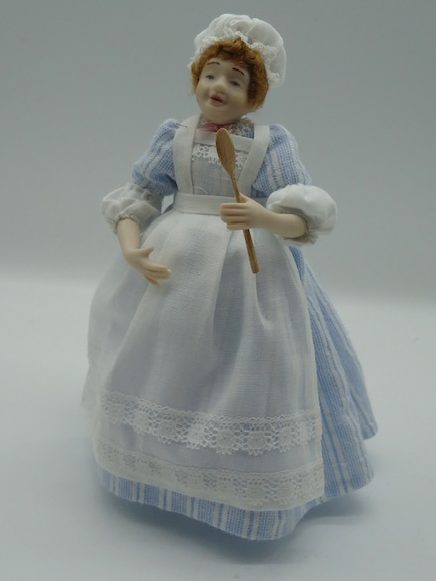 The porcelain doll will be dressed in underwear, a dress, and an apron, then her hair is styled and she is fitted with a bonnet. The doll is also given leather ankle boots.