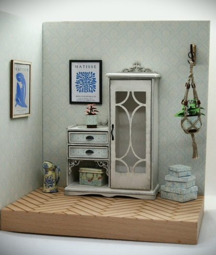 The room box with accessories such as a jug, pictures, hanging baskets and plants, boxes, etc. can then be completed independently at home. A wide range of materials is available and is included in the course price.