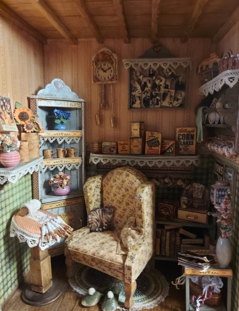 She decorated the small room box in the style of the garden shed where Dorothea collected everything she loved: pictures from times gone by, old porcelain, her bobbin lace pillow, an old Black Forest clock, a cosy reading chair and colourfully painted furniture.